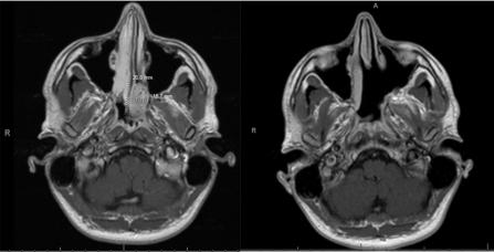 Magnetic resonance imaging (MRI) showing a left olfactory neuroblastoma with extension to the left medial orbital wall and the nasal septum before and after endoscopic surgery